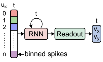 Our focus is on real-time performance, which requires minimal latency between the moment that neural activity is observed and when a corresponding prediction is generated. This constraint significantly limits the time duration, and consequently the amount of data, that a model can use for each new prediction.