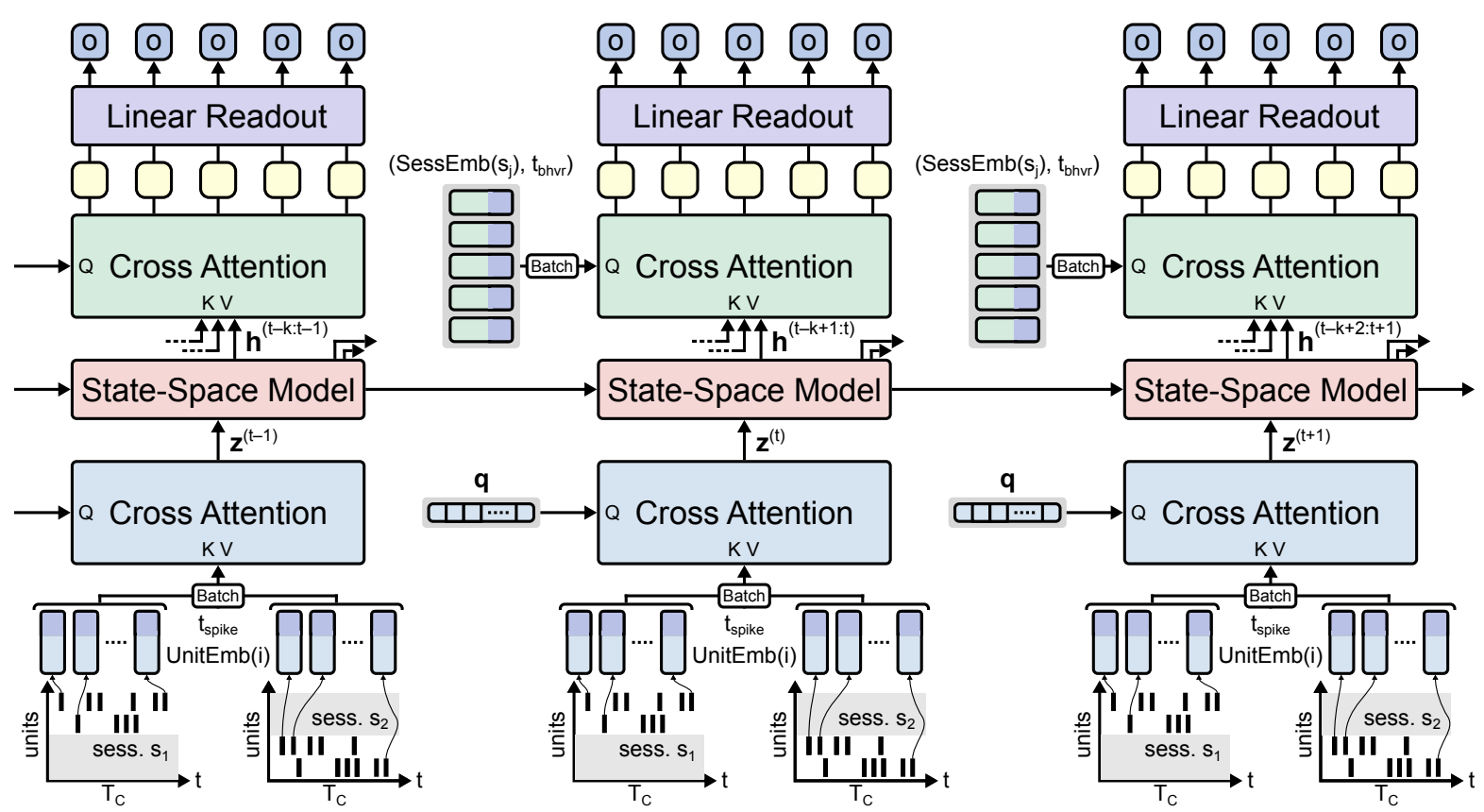 Unlike traditional methods that rely on rigid time-binning, POSSM operates at a millisecond-level resolution by tokenizing individual spikes. In essence, POSSM builds on a POYO-style cross-attention encoder that projects a variable number of spike tokens to a fixed-size latent space. The resulting output is then fed to an SSM that updates its hidden state across consecutive chunks in time.
