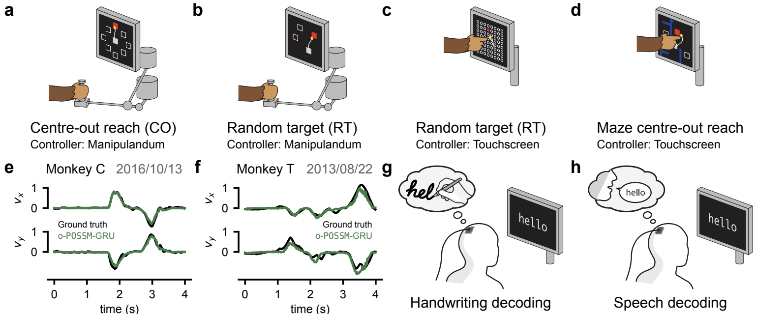 我们评估了 POSSM 在猴子运动任务的皮层内解码中的解码性能和推理速度,并展示了它在临床应用中的扩展,即人类受试者的手写和语音解码。