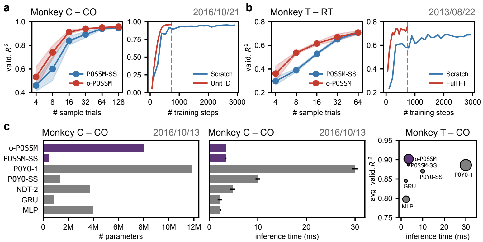 除了训练和微调效率高之外,我们还评估了 POSSM 在推理时是否高效。在图 4c 中,我们报告了工作站级 GPU(NVIDIA RTX8000)上 POSSM 和几种最先进神经解码器的参数计数和每个时间块的推理时间。