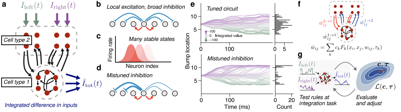 Figure 1: Learning plasticity rules that antagonistically integrate inputs using meta-learning (a) A central complex-like network receives right and left inputs, the integrated difference of which is the target output of cell type 2. (b) Typically integration is explained by continuous attractor networks, which use local excitation and global inhibition to maintain a manifold of marginally stable states (c). (d) Mistuning causes integration behavior to deteriorate (e). (f) We meta-learn a set of unsupervised plasticity rules that act on synapses within the circuit using only local information: preand postsynaptic activity $(x_j , x_i)$, eligibility traces of these activities, regulated by time constants ($\tau$), synapse size ($w_{ij}$), and input current from other cell types. (g) Coefficients and time constants are iteratively tuned.