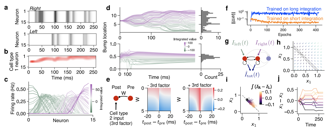 Figure 2: Discovered rules faithfully organize integrators in a central complex-like circuit and simplified 3-neuron system (a) Example right and left inputs, which are delivered to distinct populations in cell type 2 (see Fig 1a). (b) Learned rules cause cell type 1 to track integrated inputs with a bump of activity. (c) Tuning curves of neurons in cell type 1 reflect a continuum of states. (d) Tracking the peak of the activity bump over many trials in the Drosophila network (top). Traces from the 3-neuron network integrating and holding inputs (bottom). (e) Synaptic weight change as a function of synapse size and timing between pre- and postsynaptic neurons for synapses between cell type 1 neurons. Recent input from cell type 2 converts anti-Hebbian kernel into symmetric potentiation. (f) Rules learned on long integration periods tend not to cause weights to converge when compared with weights learned on short integration periods. (g) The 3-neuron model. Two excitatory neurons receive right and left inputs and are inhibited by mutual, global inhibition. (h) Illustrative flow field for rules that continually change weights. A fixed point can be moved about a manifold of possible locations to maintain memory. (i) A simplified model containing anti-Hebbian plasticity, input potentiation, and a presynaptic bound can integrate and its activity states are constrained to a manifold. (j) Integrated traces over time for model in (i).
