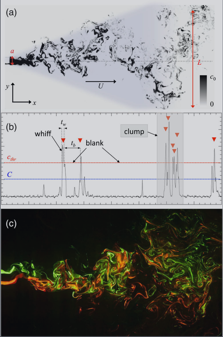FIG. 1. The structure of a turbulent odor plume. (a) A twodimensional section of a plume from the jet-flow experiment. The shaded area is the projection of the conical average plume, i.e., the region outside of which crosswind transport is weak and the odor concentration decays rapidly. (b) A typical time series of the odor concentration at a given point in space. Red triangles indicate the occurrence of whiffs, i.e., intervals when the local concentration is above the threshold cthr indicated by the red line. For olfactory searches, the threshold is comparable to the sensitivity of the pheromone receptors of the insects. The blue line indicates the average concentration C in the regions where the signal is above the noise level. (c) A two-dimensional section of two blending plumes from the jet-flow experiment. The two different chemicals mix as they progress downwind, and the resulting signal is a blend.