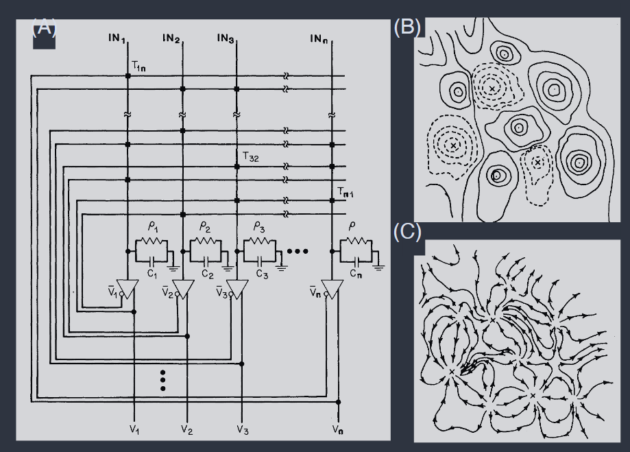 图二. 对称网络中的等效电路和动力学(Hopfield 和 Tank,1986 年)。(A)…(B)(A)中电路的示意能量函数;实线轮廓高于平均水平,虚线轮廓低于平均水平,X 标记能量谷底的固定点。(C)相应的动力学,显示为流场。