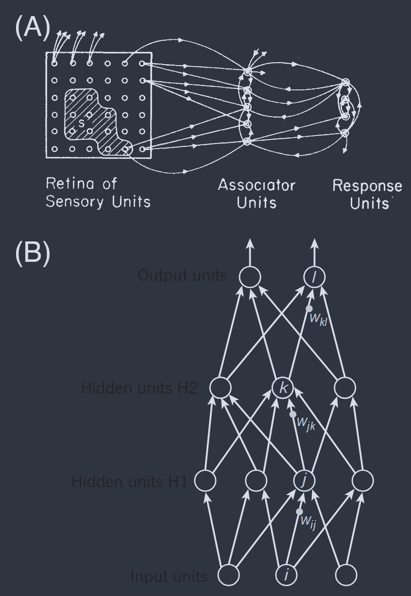 FIG. 1 Neural networks with a feed-forward architecture, or “perceptrons.” (A) An early version of the idea, from Block (1962). (B) A modern version, with additional hidden layers. The first steps in the modern AI revolution involved similar networks, with many hidden layers, that achieved human-level performance on image classification and other tasks (LeCun et al., 2015).