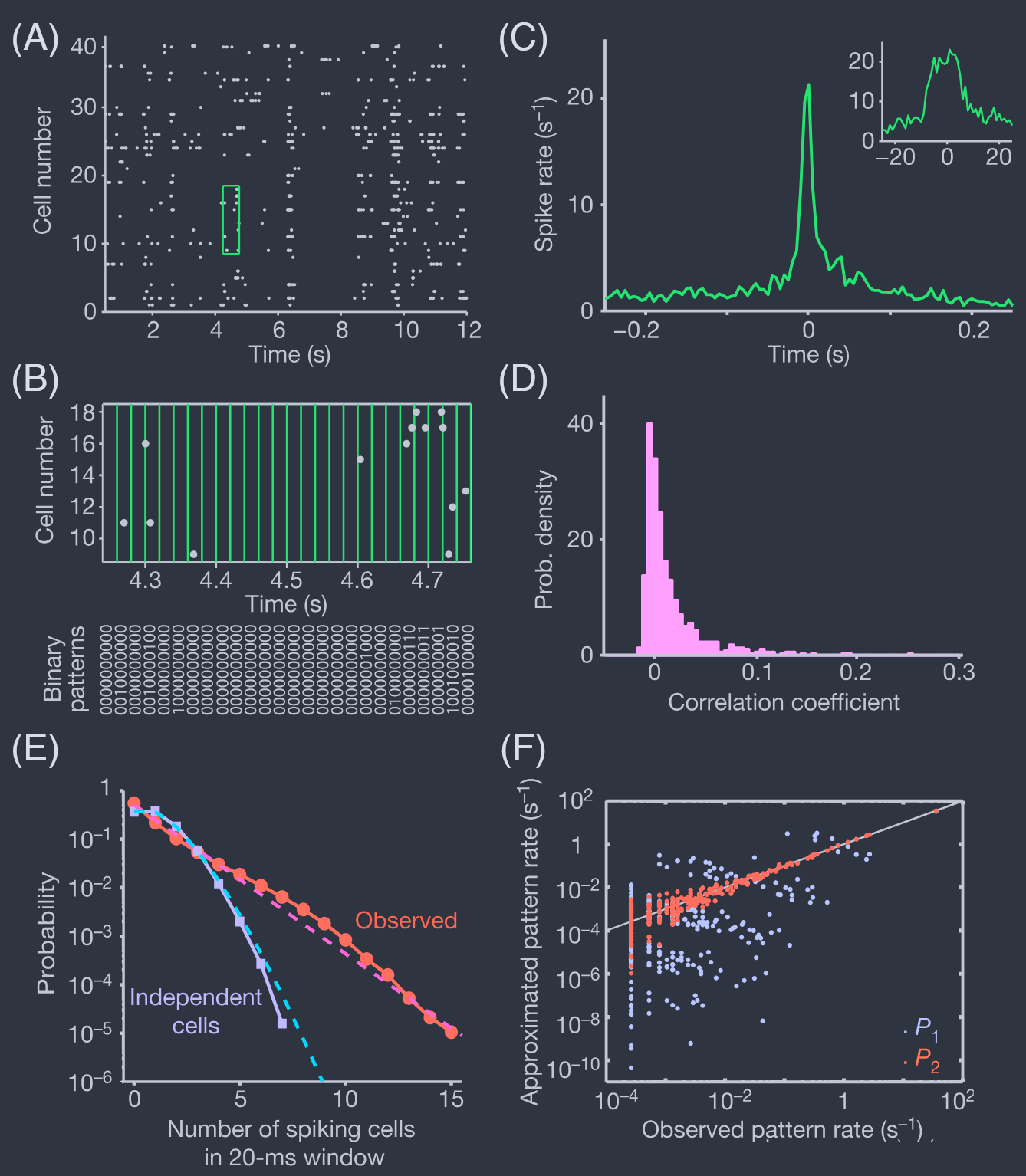 如果我们只看两个神经元,由于相关性非常弱,它们相互独立的近似是非常好的。但如果我们更全面地观察,那么广泛的相关性会结合起来产生定性的影响。作为一个例子,我们可以询问在同一时间段内 $N = 40$ 个神经元中有 $K$ 个活跃的概率 $P_{N}(K)$,我们发现如果细胞是独立的,这个概率的尾部要长得多(图 7E);$K = 10$ 个神经元的同时活动已经比独立模型高出约 $10^{3}$ 倍。