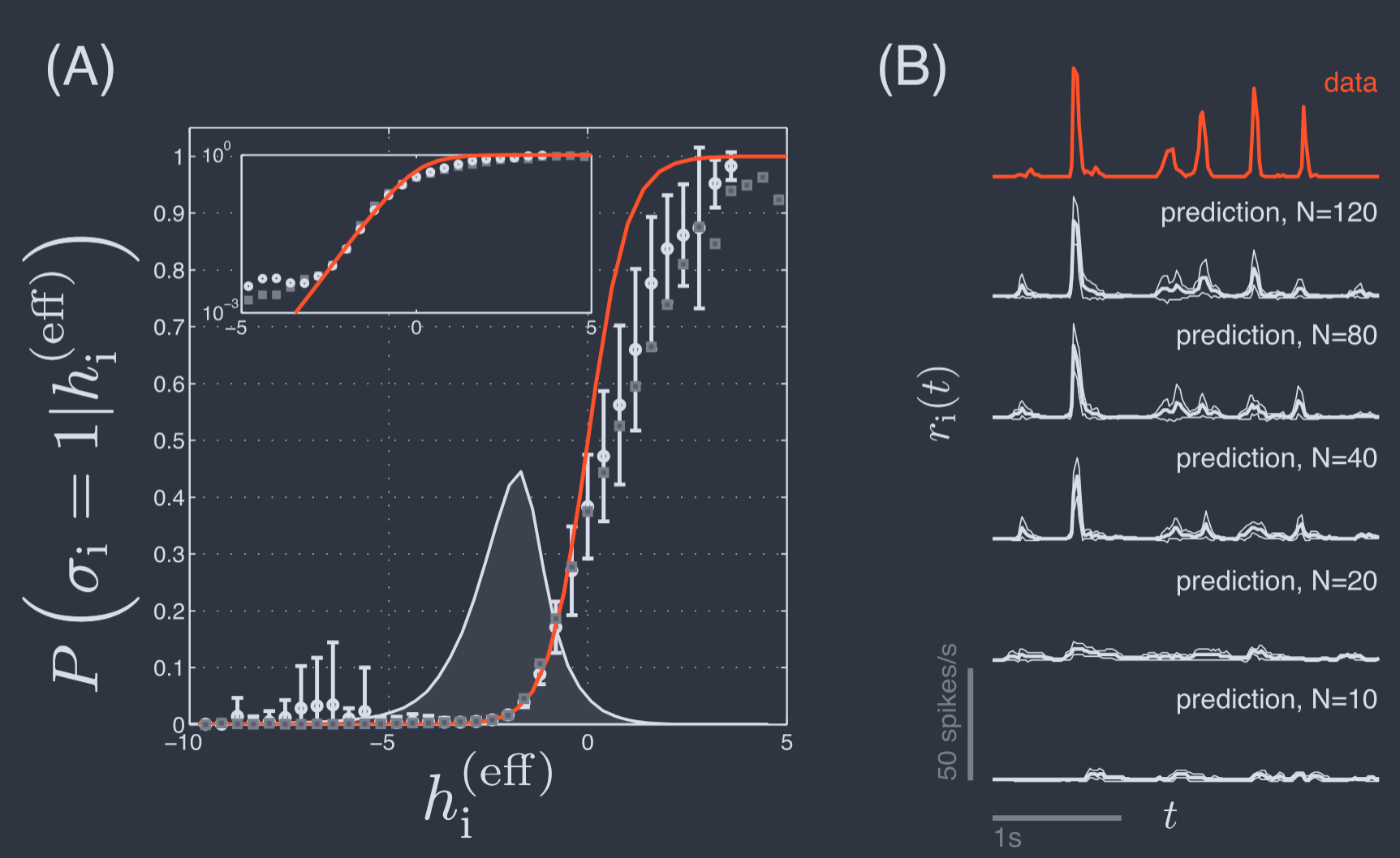 图 11 视网膜中神经活动的有效场和集体特征(Tkacˇik 等人,2014)。(A)在 $N = 120$ 的情况下,给定网络其余部分状态时单个神经元活跃的概率。带误差条的点是数据,有效场是根据方程(50)从模型中计算得出的。红线是方程(49)的预测,灰色点是纯成对而不是“$K$–成对”模型的结果。阴影灰色区域显示了实验中场的分布,强调了在大正场处的误差处于分布的尾部。插图以概率的对数刻度显示相同的结果。(B)在重复的自然电影中,单个神经元活跃的概率,归一化为每单位时间内动作电位(尖峰/秒)的概率。顶部为红色,表示实验数据。下方轨迹为黑色,基于 $N$ 个细胞组中其他神经元状态的预测,基于方程(B8,50)。实线是电影所有重复的平均预测,细线是包络线 $\pm$ 一个标准差。