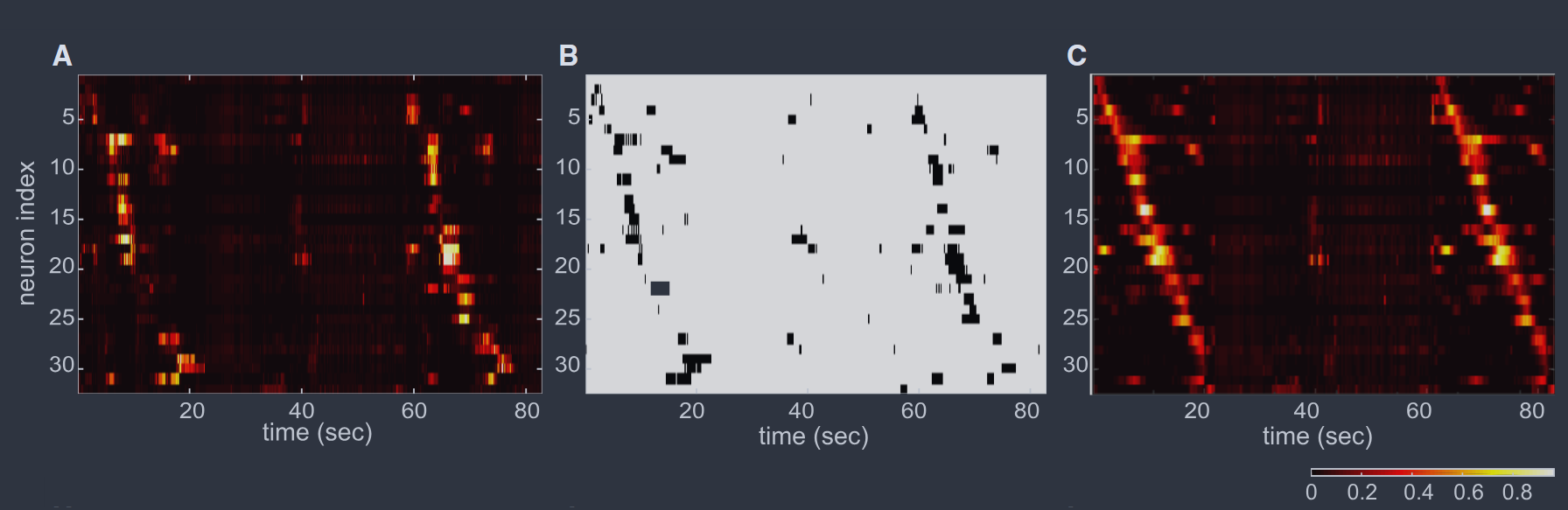 As a final example we consider populations of $N\sim 100$ neurons in the mouse hippocampus (Meshulam et al., 2017). The hippocampus plays a central role in navigation and episodic memory, and is perhaps best known for its population of “place cells,” neurons that are active only when the animal moves to a particular position in its environment. First discovered in rodents (O’Keefe and Dostrovsky, 1971), it is thought that the whole population of these cells together provides the animal with a cognitive map (O’Keefe and Nadel, 1978). More recent work shows how this structure extends to three dimensions, and across hundreds of meters in bats (Tsoar et al., 2011; Yartsev and Ulanovsky, 2013).