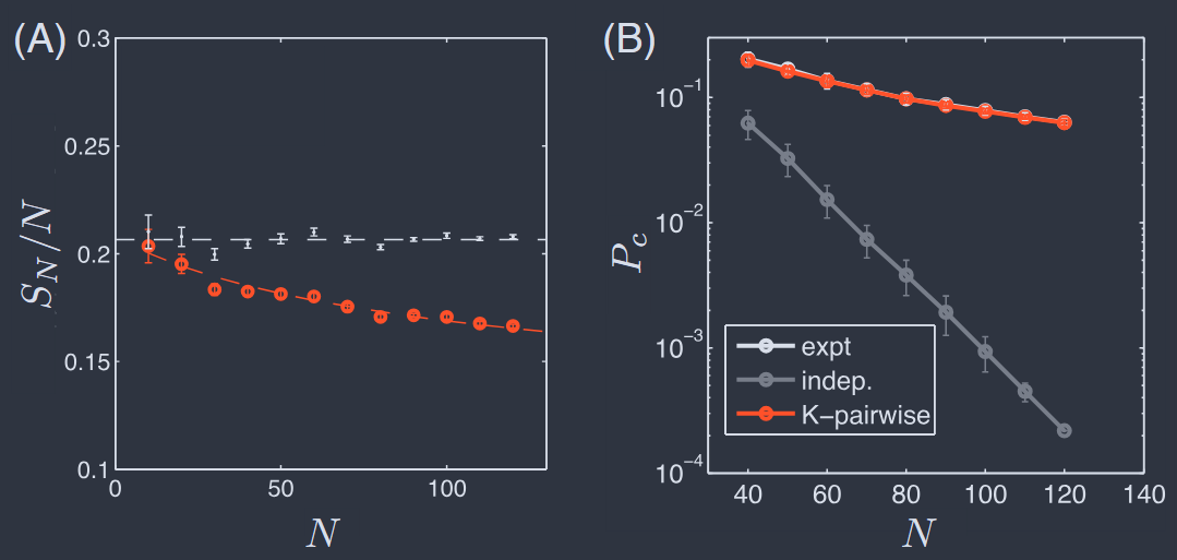 The $\sim 25%$ reduction in entropy is significant, but more dramatic (and testable) is the prediction that the distribution over states is extremely inhomogeneous. Recall that if the distribution is uniform over some effective number of states $\Omega_{\text{eff}}$ then the entropy is $S = \log{\Omega_{\text{eff}}}$ and the probability that two states chosen at random will be the same is $P_{c} = 1/\Omega_{\text{eff}}$ ; for non–uniform distributions we have $S\geq − \log(P_{c})$. If neurons were independent then with $N$ cells we would have $P_{c}\propto e^{−\alpha N}$, and this is what we see in the data once they are shuffled to remove correlations (Fig. 12B). But the real data show a much more gradual decay with $N$ , and this is captured perfectly by the $K$–pairwise maximum entropy models.