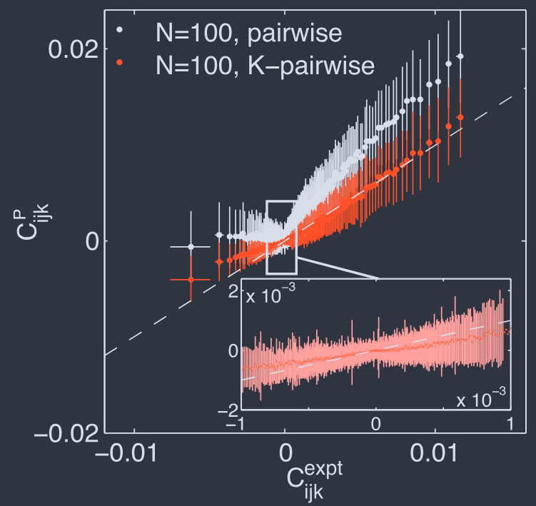 图 9 视网膜中 $N = 100$ 个细胞的三元组相关性(Tkaˇcik 等人,2014)。测量的 $C_{ijk}$(x 轴)与模型预测的值(y 轴),显示为单个子组。大约 $1.6 \times 10^{5}$ 个不同的三元组被分成 1000 个同等人口的箱;x 轴上的误差条是跨箱的标准差。预测的相应值被分组在一起,产生预测的均值和标准差(y 轴)。插图放大了 $K$–成对模型中小相关性的预测主体。原始参考使用 $\sigma_{i} = \pm 1$,因此这里显示的所有 $C_{ijk}$ 都比 $\sigma_{i} = {0, 1}$ 表示法中的值大 $8\times$。