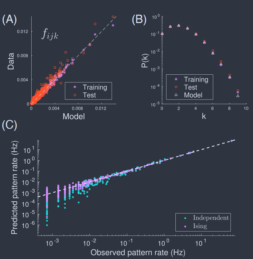 FIG. 13 Pairwise maximum entropy models describe collective behavior of $N = 37$ neurons in prefrontal cortex (Tavoni et al., 2017). (A) Observed vs predicted triplet correlations among all neurons. Training results (blue) are predictions from the same segment of the experiment where the pairwise correlations were measured; test results (red) are in a different segment of the experiment. (B) Probability that $K$ out of $N$ neurons are active simultaneously, comparing predictions of the model with data in training and test segments. (C) Rate at which patterns of spiking and silence appear in a subset of ten neurons, comparing predicted vs observed rates in an independent model (cyan) and in the pairwise model (blue).