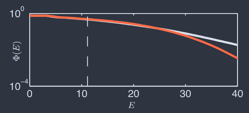 FIG. 10 The cumulative distribution of energies for $N = 120$ neurons (Tkacˇik et al., 2014). $\Phi(E)$ is defined in Eq (48), and averages are over data (black) or the theory (red). Dashed vertical line denotes an energy $E_{2k}(\sigma)$ such that the particular state $\sigma$ should occur on average once during the duration of the experiment.