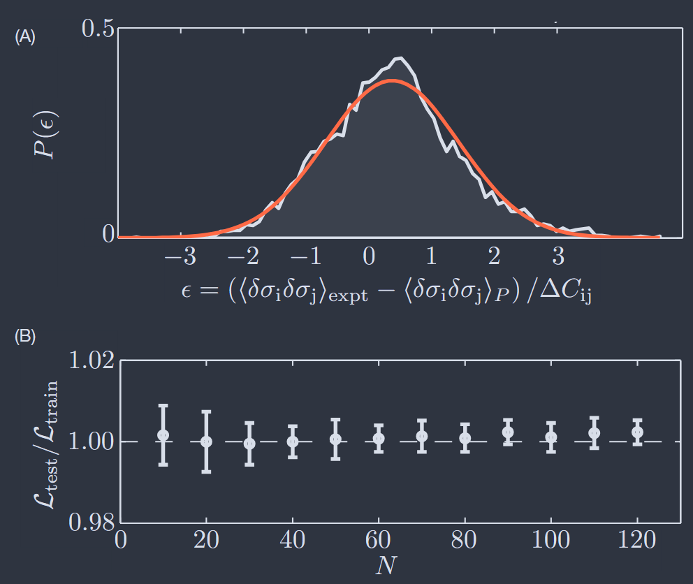 To conclude this introduction, we emphasize that maximum entropy is unlike usual theories. We don’t start with a theoretical principle or even a model. Rather, we start with some features of the data and test the hypothesis that these features alone encode everything we need to describe the system. Whenever we use this approach we are referring back to the basic structure of the optimization problem defined in Eq (18), and its formal solution in Eqs (20, 21), but there is no single maximum entropy model, and each time we need to be explicit: Which are the observables $f_{\mu}$ whose measured expectation values we want our model to reproduce? Can we find the corresponding Lagrange mutlipliers $\lambda_{mu}$? Do these parameters have a natural interpretation? Once we answer these questions, we can ask whether these relatively simple statistical physics descriptions make predictions that agree with experiment. There is an unusually clean separation between learning the model (matching observed expectation values) and testing the model (predicting new expectation values). In this sense we can think of maximum entropy as predicting a set of parameter free relations among different aspects of the data. Finally, we will have to think carefully about what it means for models to “work.” We begin with early explorations at relatively small $N$ (§IV.B), then turn to a wide variety of larger networks (§IV.C), and finally address how these analyses can catch up to the experimental frontier (§IV.D).