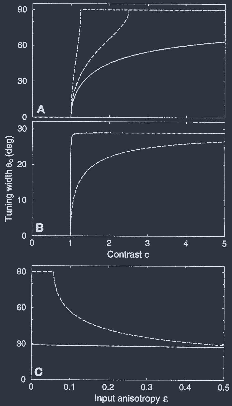 The above solution holds for suprathreshold contrast, $c > 1$. Otherwise, $M(\theta)$ is zero. In the following, we study the orientation tuning properties of the steady-state solution. In particular, we examine the dependence of the tuning width on the stimulus contrast, $c$, and anisotropy, $\epsilon$, for different ranges of values of the connectivity parameters.