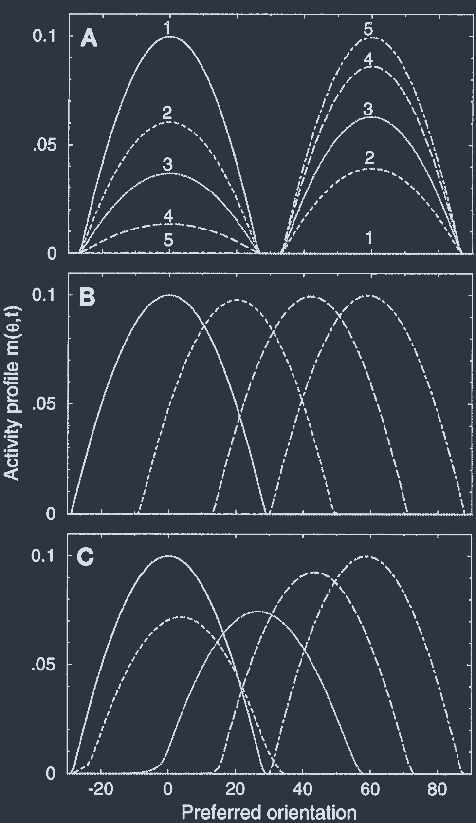(A) Hubel-Wiesel model with uniform inhibition. The activity profile centered at $0°$ decays while a new one, centered around $60°$, grows. Neurons in intermediate columns (e.g., with $0 = 30°$) stay in the quiescent state during the whole process. The time constant of the decay and growth is $\tau_{0}$. Times are 0, 0.5, 1, 2, and 6 $\tau_{0}$ (lines 1-5, respectively). Parameters are as in Fig. 1B (dashed line) and $c = 5$. For this value of contrast, the maximal activity level relative to saturation is 0.1, which corresponds to a rate of $\approx 50$ spikes per sec.